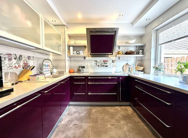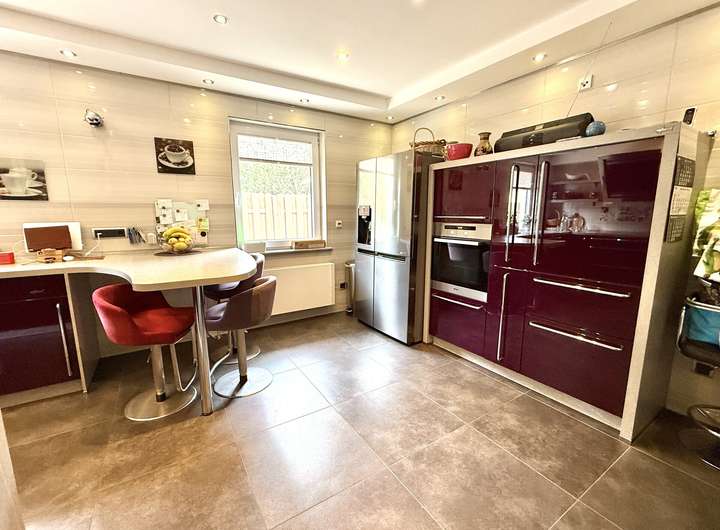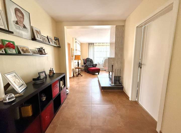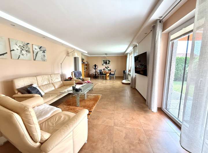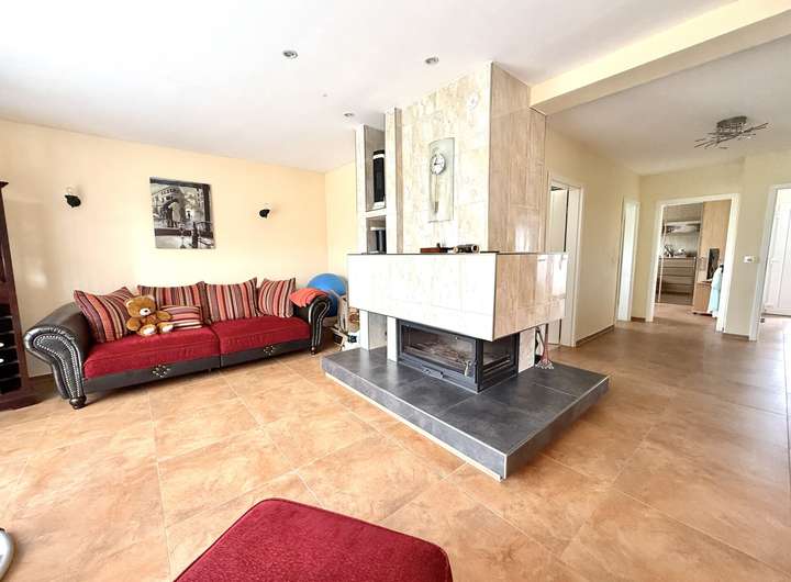 Im Erdgeschoss erwarten Sie ein helles Wohn- und Esszimmer, ein weiteres Wohnzimmer mit Kamin, eine große gespflegte Küche, ein Schlafzimmer und zwei Badezimmer. Von hier aus haben Sie Zugang zum Keller sowie zu Garage, Carport und einem praktischen Geräteraum.