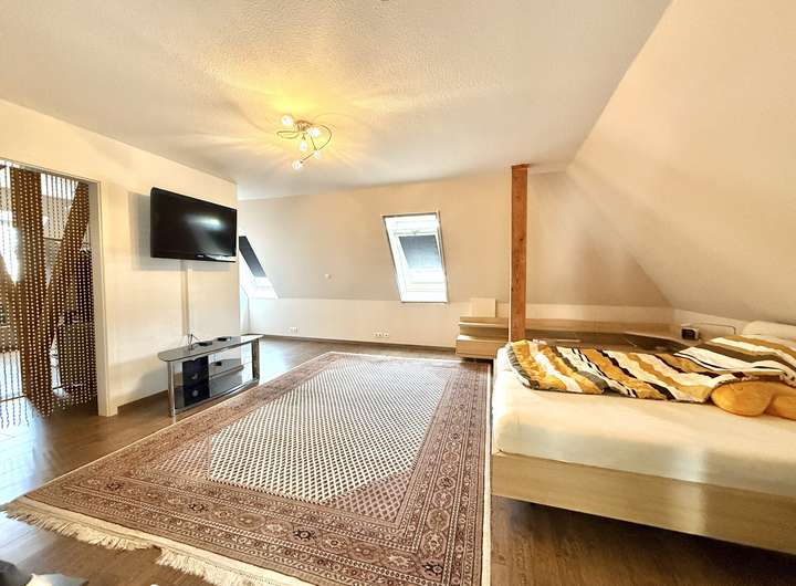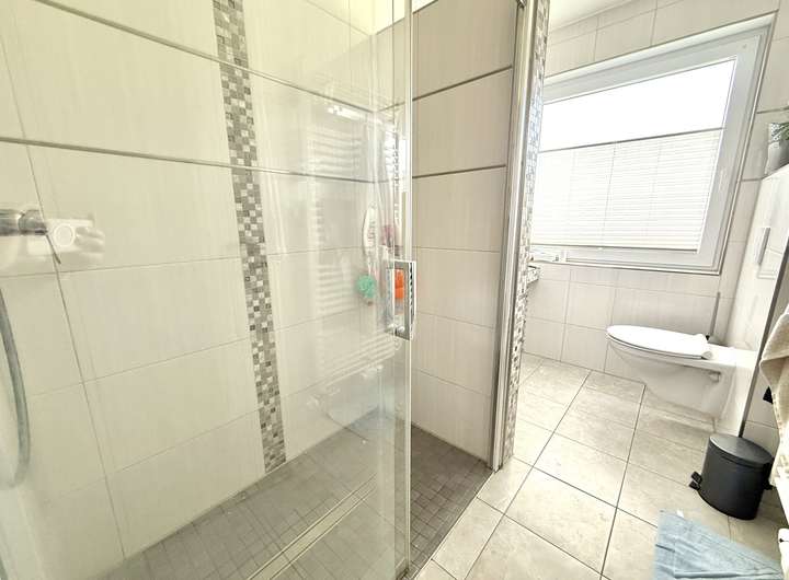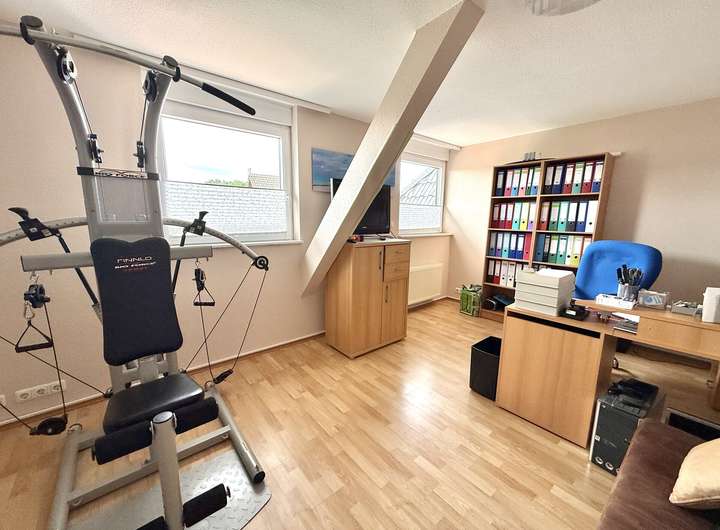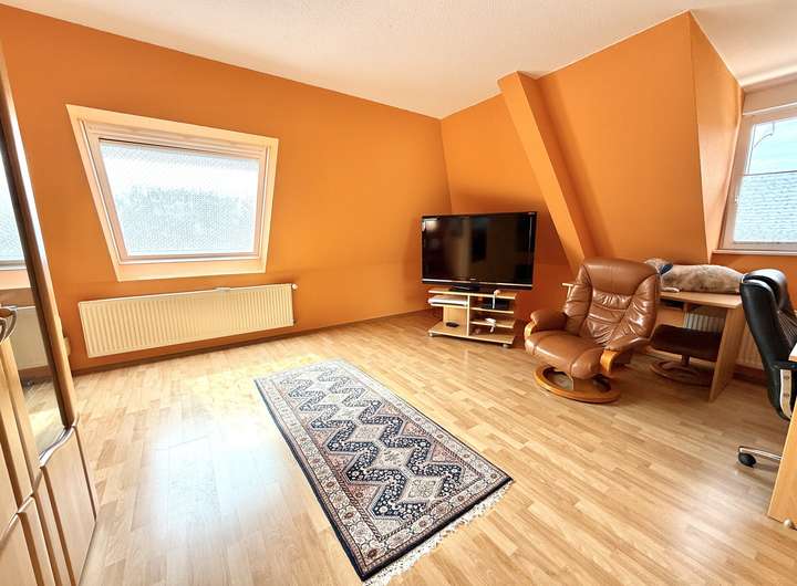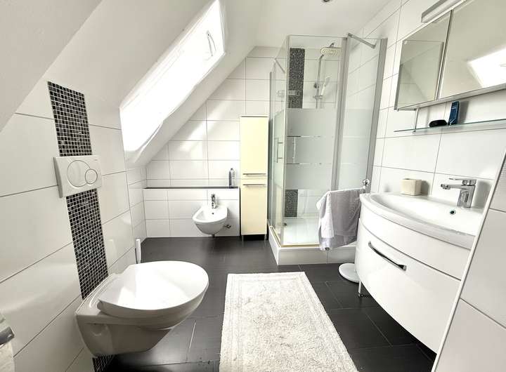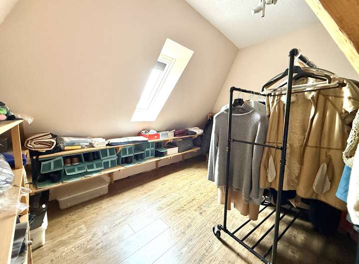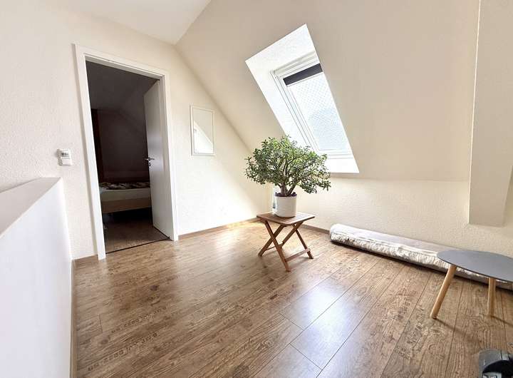 Im Dachgeschoss befinden sich ein großes Schlafzimmer, zwei Kinderzimmer sowie ein Badezimmer mit Dusche und WC. Der Flur verbindet alle Räume und sorgt für eine gute Aufteilung.