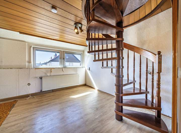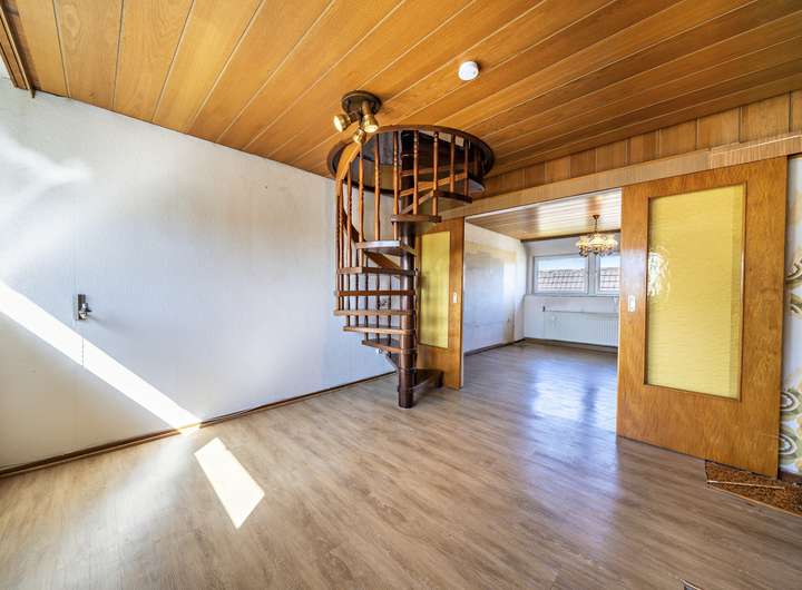 OG: Küche, Wohnzimmer, Schlafzimmer, Kinderzimmer, Tageslichtbad, Wendeltreppe zum ausgebauten DG.