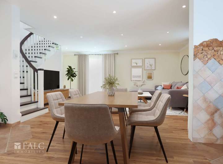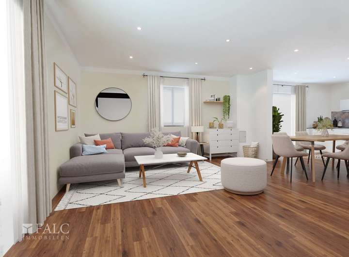 Weiter geht es in den offenen Wohnbereich, der durch seine großzügigen Fenster viel Tageslicht bietet. Der Wohnbereich ist harmonisch mit dem Essbereich verbunden, was eine ideale Umgebung für gesellige Abende schafft. Die angrenzende Küche ist modern ausgestattet und bietet ausreichend Platz für kulinarische Kreationen.