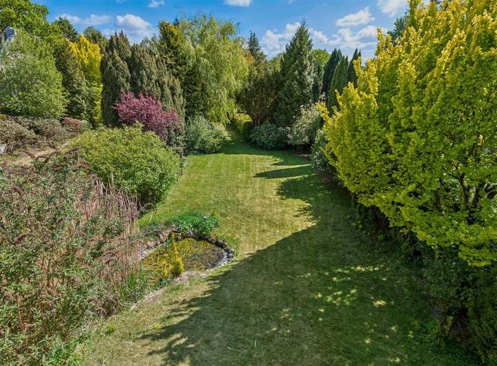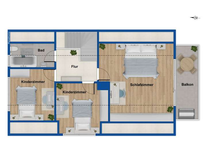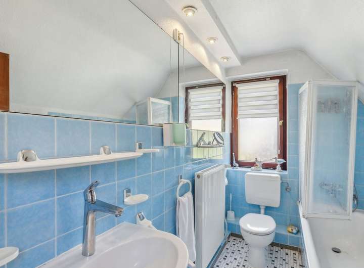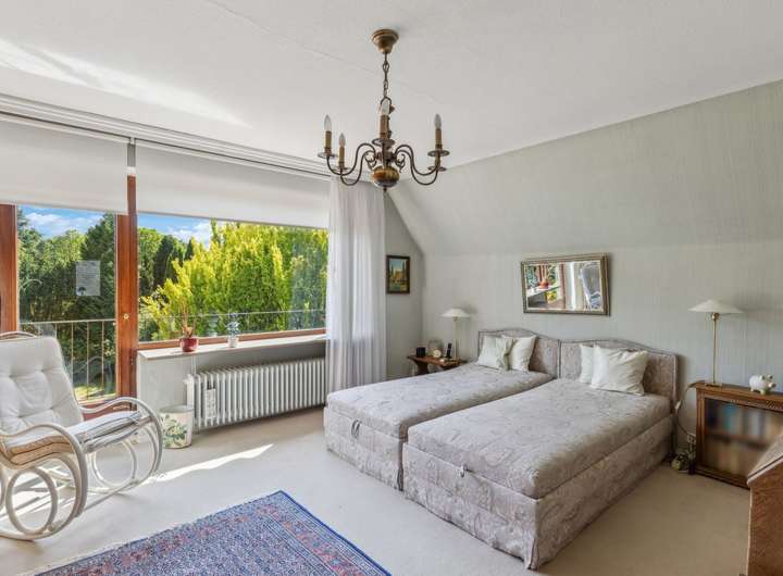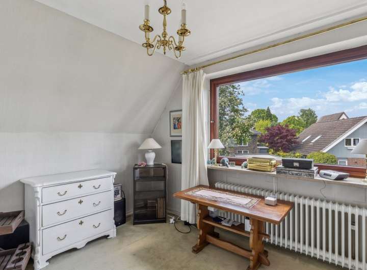 Im Obergeschoss liegen drei weitere Zimmer und ein Vollbad. An das große Elternschlafzimmer schließt ein Balkon an, der einen fantastischen Blick in den Garten bietet. Die beiden anderen Zimmer liegen daneben und eigen sich hervorragend als Kinderzimmer, Büro oder Gästezimmer.