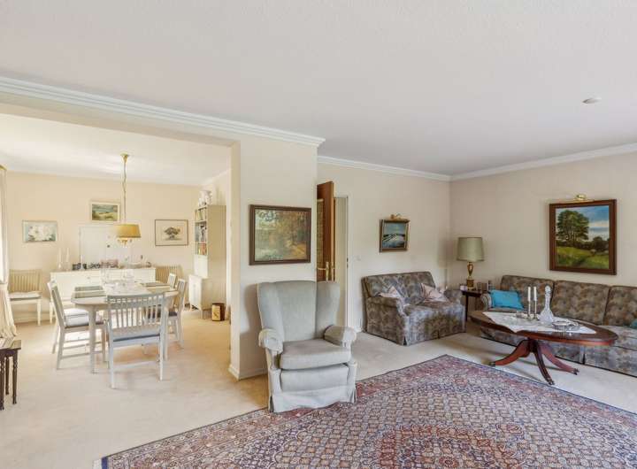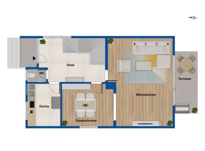 Sie betreten das Haus über die geräumige und helle Diele. Davon abgehend befinden sich im Erdgeschoss das Gäste-WC, die Küche, das Esszimmer und der Wohnbereich. Wohn- und Essbereich gehen ineinander über und bieten den Blick auf die große Terrasse und das wundervolle Grundstück.