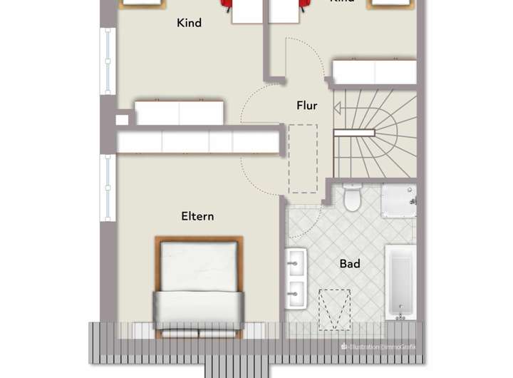 Entspannung finden Sie im Obergeschoss des Hauses. Neben den drei Schlafzimmern bietet hier ein Bad mit Badewanne und Dusche Erholung.