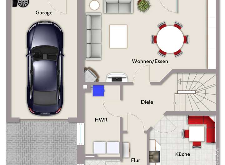 Im Erdgeschoss stehen Ihnen neben einem sehr großen und komfortablen Wohn- und Essbereich, eine Küche, ein HWR, ein Gäste-WC und ein Flur zur Verfügung.