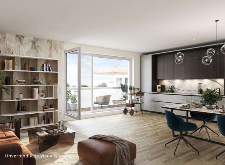 Echtholzparkett verleiht allen Wohnbereichen natürlich-wohnliches Flair, während die moderne Fußbodenheizung ganzjährigen Komfort gewährleistet. Die großzügigen Raumhöhen von 2,75 Metern schaffen ein luftiges Wohngefühl, das durch hochwertige Sanitärausstattung namhafter Markenhersteller komplettiert wird. Die private Dachterrasse erweitert den Wohnraum nach außen und bietet direkten Bezug zur grünen Umgebung.