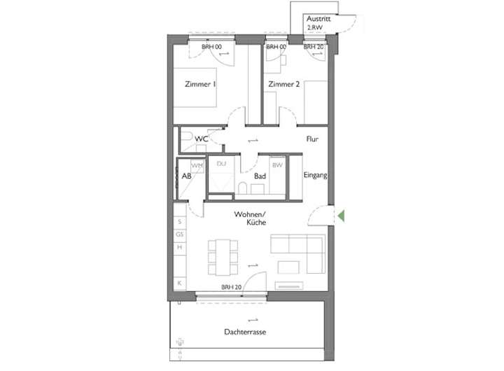 Der offene Wohn-Küchenbereich schafft großzügige Wohnverhältnisse, während das separate Schlafzimmer zusätzliche Privatsphäre bietet. Ein zusätzliches Zimmer eignet sich perfekt als Kinder- oder Arbeitszimmer.