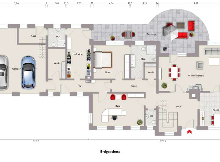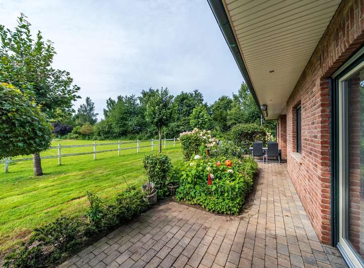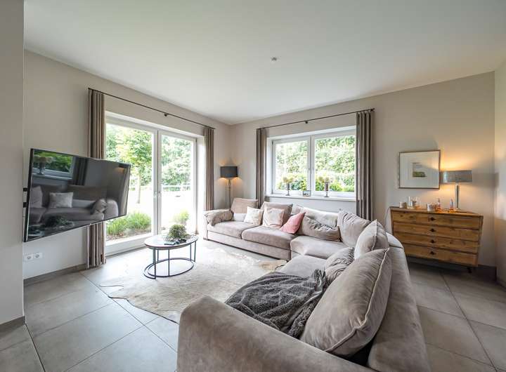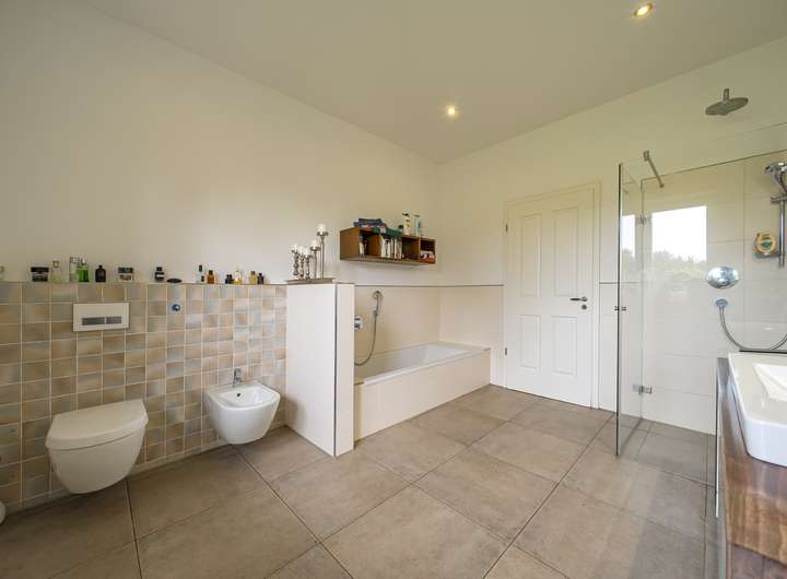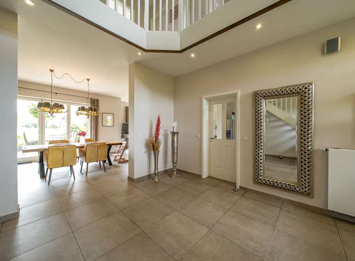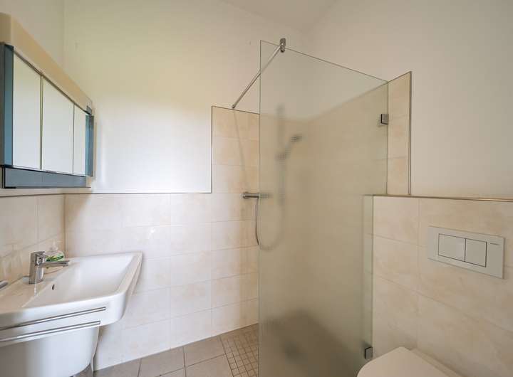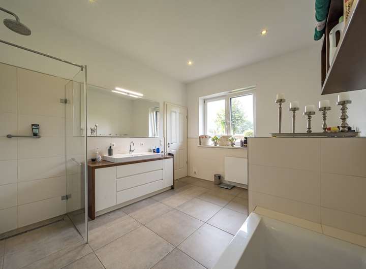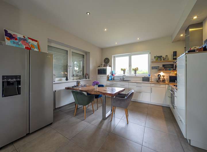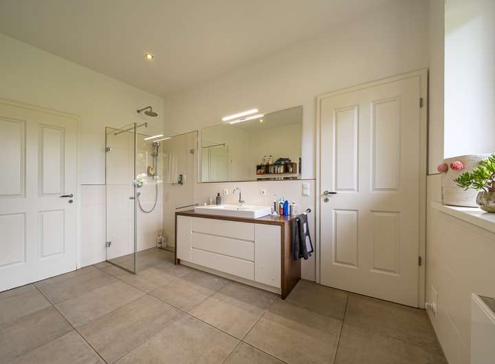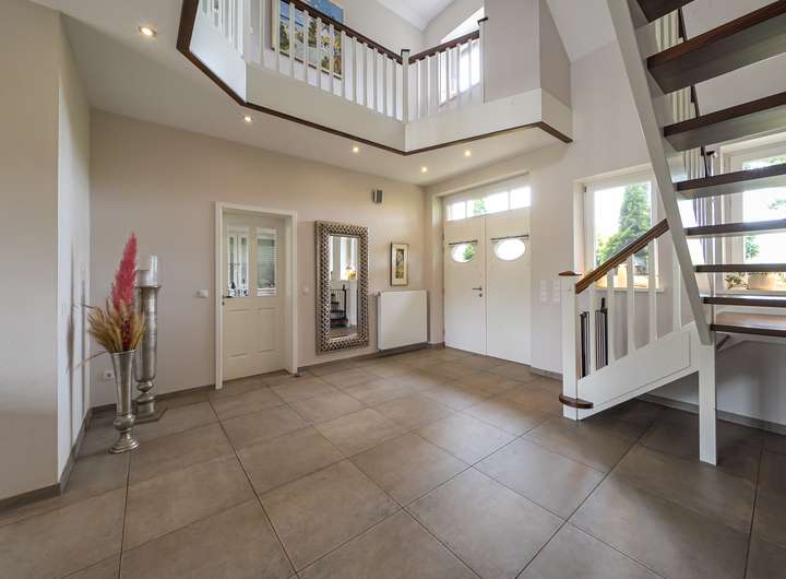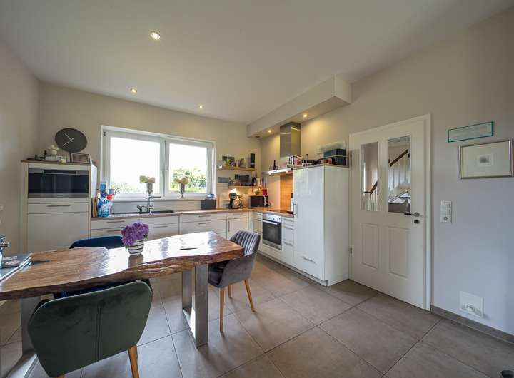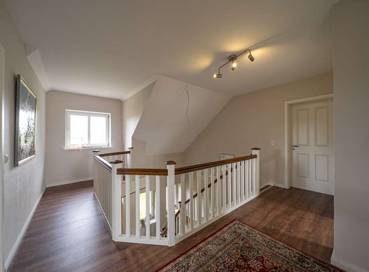 Individuelle Ausstattungsmerkmale: - teilw. Fußbodenerwärmung - Rollläden - Ofen - Markise - Einbauküche - Betondecke - barrierefreie Dusche - elektrische Rollläden Aufteilung: Erdgeschoss: Diele, Küche, Wohn-/Esszimmer, Gäste-WC, Büro, Abstellraum, Bad, Schlafzimmer, Ankleide, weitere Abstellräume, kl. Bad Terrasse Dachgeschoss: Empore, Bad, 2 Schlafzimmer, HWR, 3 Bodenräume Doppelgarage Ställe