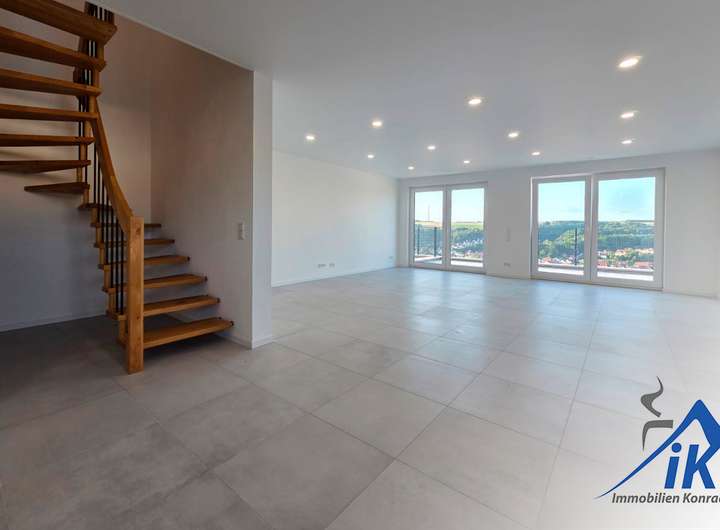 Im Erdgeschoss erwartet Sie ein beeindruckendes, lichtdurchflutetes Wohnzimmer, das durch seine Großzügigkeit besticht und Zugang zur einladenden Terrasse bietet. Von hier aus genießen Sie einen herrlichen Ausblick über Thaleischweiler, der jeden Tag zu einem Erlebnis macht.