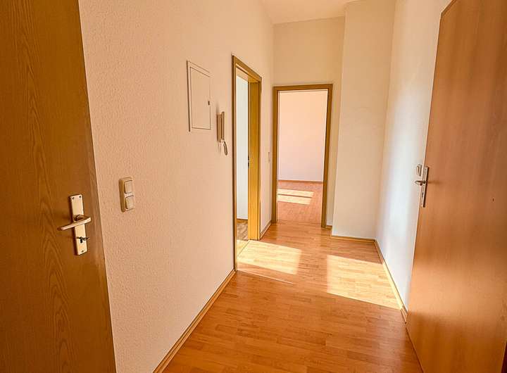 Über einen langen geräumigen Flur gelangen Sie in das schöne helle Wohn-Schlafzimmer mit Ausgang zum Balkon, die Küche sowie das Tageslichtbad mit Wanne.