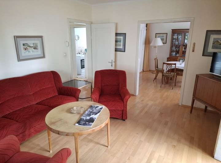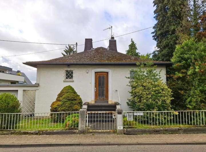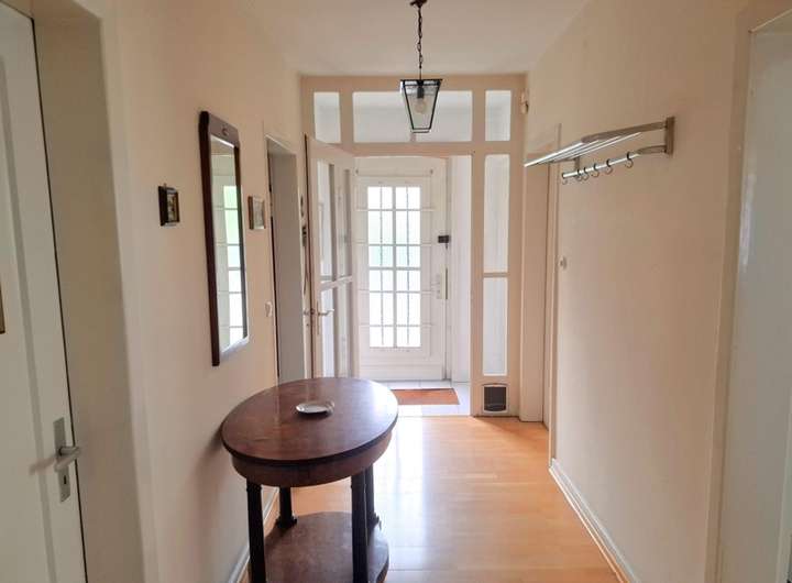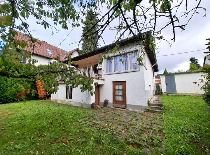 Die aktuelle Bebauung: Baujahr 1950er – Charme trifft auf notwendige Modernisierung. Die Räume sind der Epoche entsprechend gemütlich und praktisch geschnitten, und der sehr großzügige Balkon in erhöhter Lage schaut entspannt auf das üppige Grün des geschützten Gartens.
