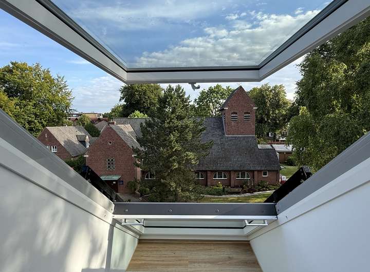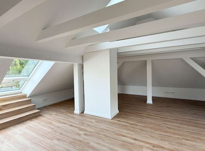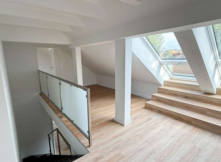 Vom Eingangsbereich führt dann eine offene Metalltreppe in das Dachgeschoss. Hier wartet mit dem riesigen Wohnzimmer das Highlight der Wohnung! Fast über die gesamte Etage erstreckt sich der besondere Raum mit der offenen Balkenlage. Damit genug Licht hereinkommt wurden viele Dachfenster eingebaut und in der Gaube gibt es zwei Dach-Balkonfenster, die nach dem Ausklappen wie ein kleiner Balkon im Dach genutzt werden können. Von hier aus hat man einen traumhaften Blick auf die Johanneskirche!