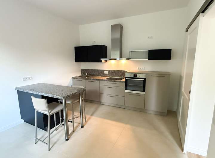 Direkt daneben, durch eine Schiebetür getrennt, befindet sich die hochwertige Küche. Diese ist ausgestattet mit einem Induktionskochfeld, Backofen, Dunstabzug und Kühlschrank. Es ist zudem eine hochwertige Granit-Arbeitsplatte verbaut und es gibt eine dazu passende Sitzgelegenheit.