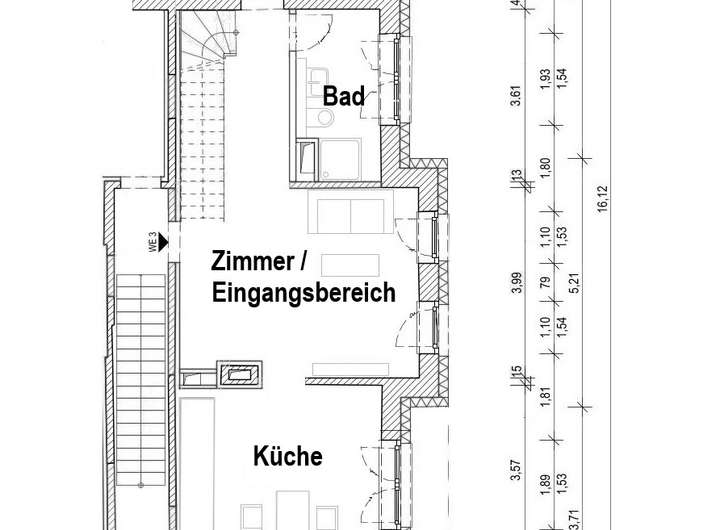 Man betritt die Wohnung im ersten Stockwerk und landet im großzügigen Eingangsbereich, dieser besteht aus einem großen, hellen Raum mit hohen Decken und bietet viele Gestaltungsmöglichkeiten, zum Beispiel als Esszimmer.