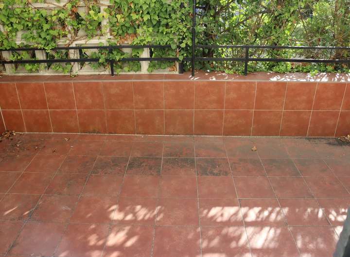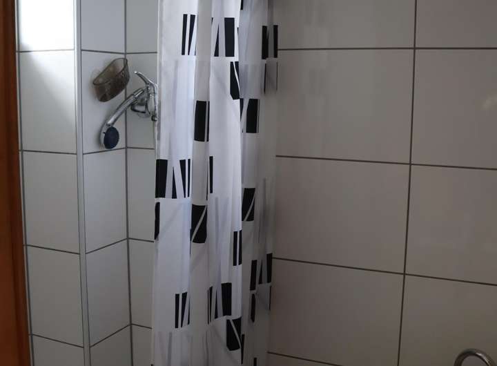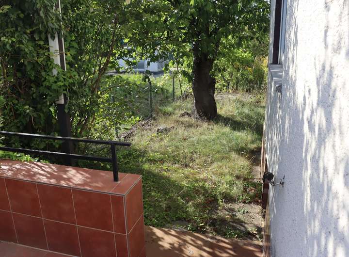 Erdgeschoss: Eingangsbereich, Duschbad mit WC, Wohnzimmer mit Balkon und Ausgang zu der kleinen Terrasse und dem Garten, Esszimmer, Küche, Flur.