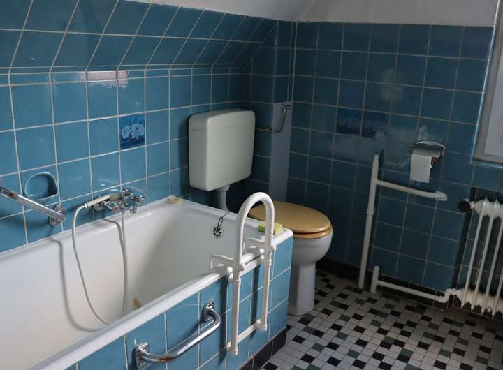 Die Böden sind mit PVC, Parkett und Fliesen belegt.