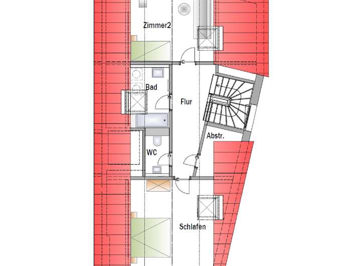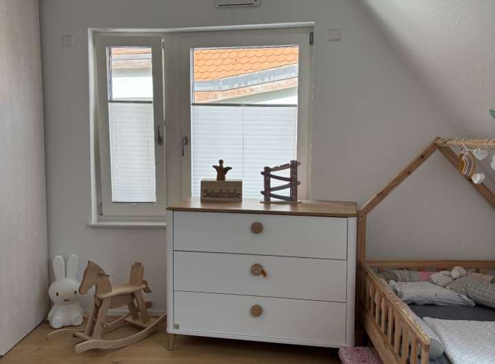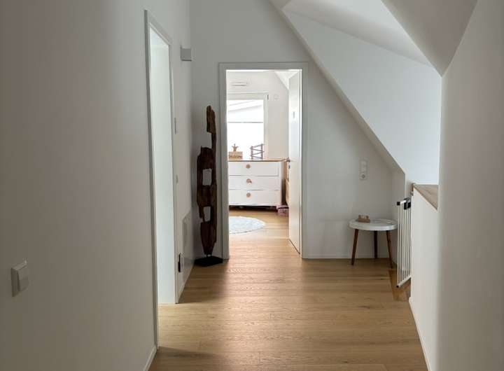 Über eine massive Treppe mit Holzstufen wird das Dachgeschoss erreicht. Hier befinden sich neben einem weiteren Kinderzimmer, ein Tageslichtbad mit Badewanne und Waschmaschinenanschluss, ein separates WC, ein weiterer Abstellraum und das Elternschlafzimmer.