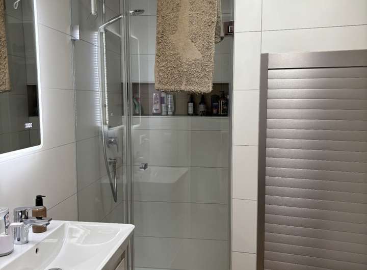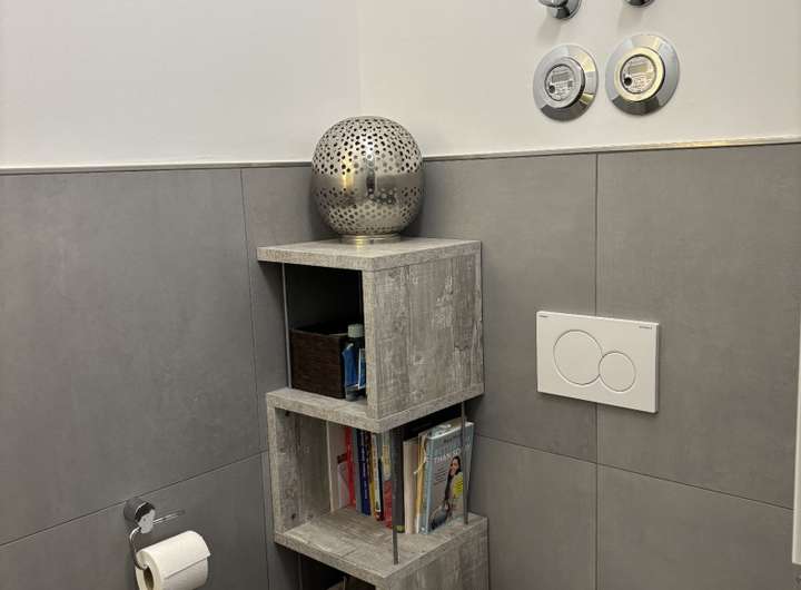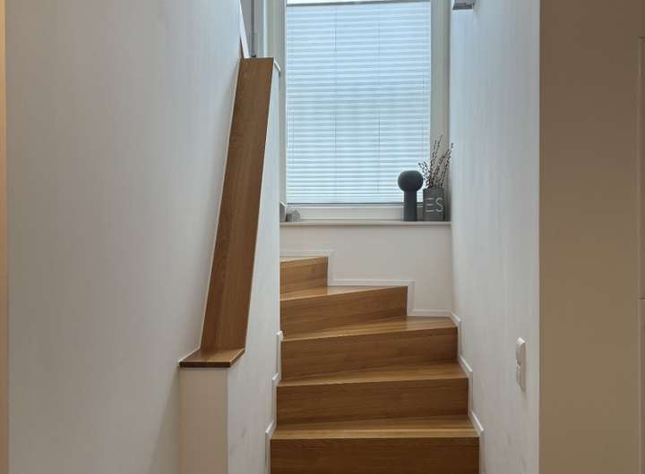 Die Wohnung ist mit Echtholzparkett ausgestattet. Das untere Bad ist mit Bodenfliesen in Holzoptik sowie beigen Wandfliesen versehen. Das obere Bad sowie das separate WC sind mit grauen Wand- und Bodenfliesen schlicht gehalten. Beheizt wird die Wohnung über eine komfortable Fußbodenheizung mit Einzelraumregelung.