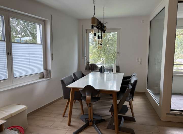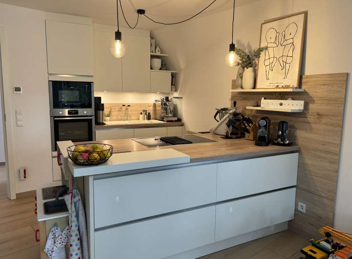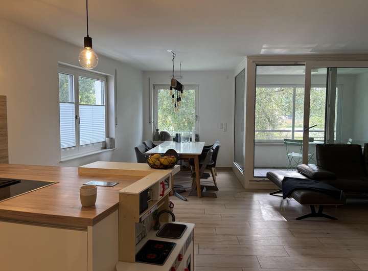 Über den Eingangsbereich erreicht man links ein innenliegendes Bad mit Dusche und Abstellraum sowie ein Kinderzimmer. Rechts erstreckt sich die großzügige offene Küche mit moderner Einbauküche, Ess- und Wohnbereich mit Zugang zur Loggia mit Blick auf das idyllische Ufer der Eyach.