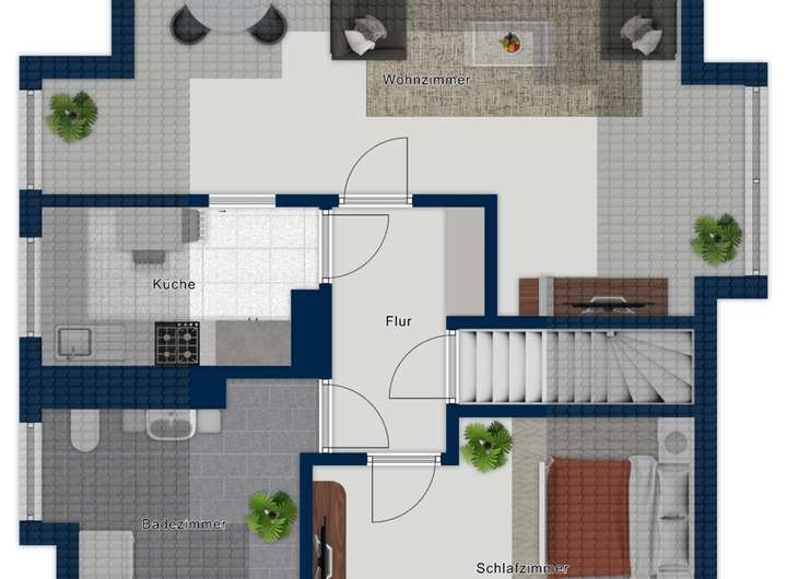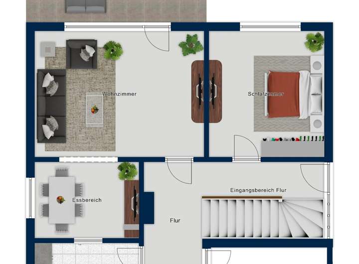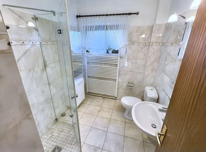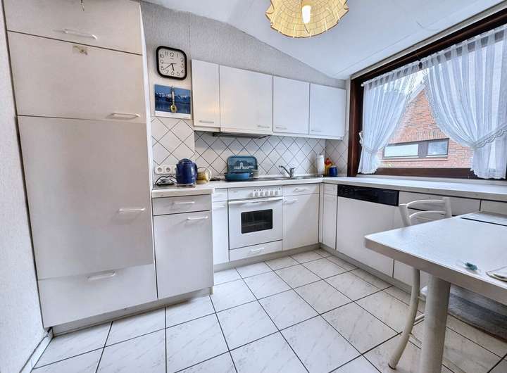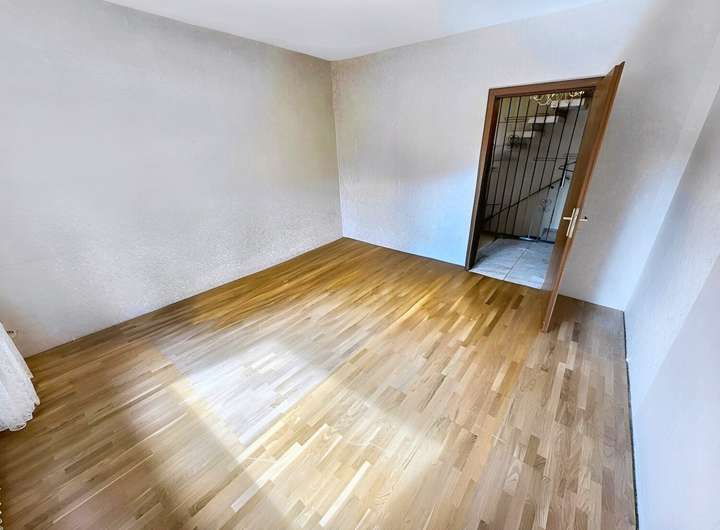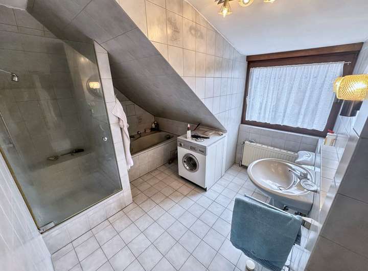 Im Erdgeschoss erwarten Sie zwei Schlafzimmer, eine geräumige Küche mit Zugang zum offenen Ess- und Wohnbereich sowie ein direkter Ausgang zur sonnigen Südterrasse, die zum Verweilen im Freien einlädt. Das modernisierte Badezimmer ist mit einer ebenerdigen Dusche und einem praktischen Handtuchheizkörper ausgestattet.