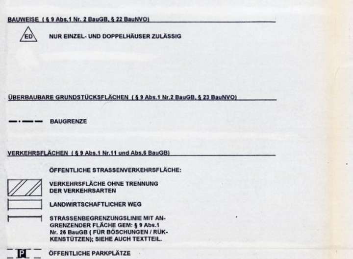 Die Bebauung richtet sich nach dem bestehenden Bebauungsplan (§ 30 BauGB). Zulässig sind Einzel- und Doppelhäuser mit maximal 2 Vollgeschossen. Die Kennzahlen des Bebauungsplans lassen dabei viel Gestaltungsspielraum: