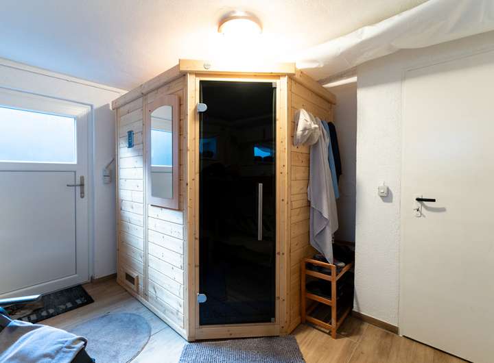 - Sauna im Keller für Wellness und Entspannung mit direktem Zugang nach draußen.