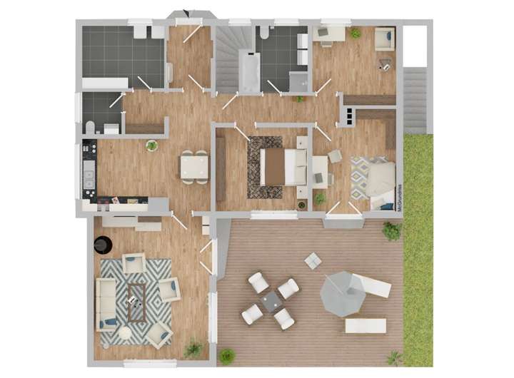 Die Raumaufteilung umfasst außerdem drei Schlafzimmer, ein Badezimmer sowie einen praktischen Abstellraum.