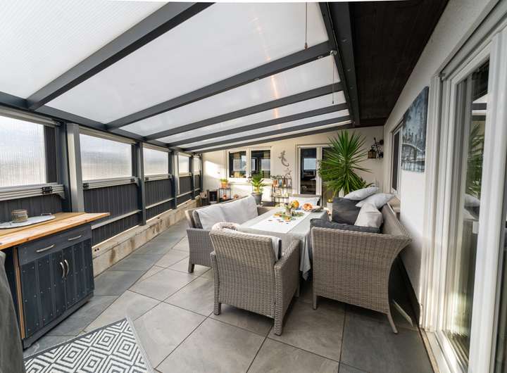 Im Haupthaus erwartet Sie ein weitläufiges Wohnzimmer mit Kaminofen, was eine behagliche Atmosphäre schafft. Direkt daran angeschlossen befindet sich ein Wintergarten, der nachträglich errichtet wurde und vielfältige Nutzungsmöglichkeiten bietet – ob zum Grillen, Kochen oder einfach zum Entspannen im geschützten Außenbereich. Alles ist bereits ausgestattet.