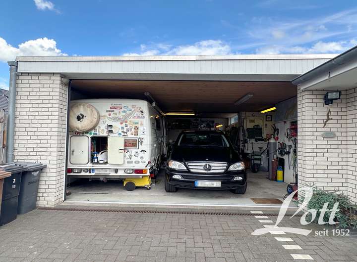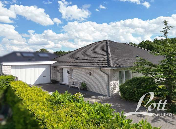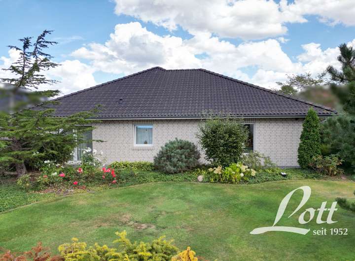 Der sehr ansprechende Bungalow wurde im Jahre 2014 in konventioneller Massivbauweise errichtet. Der Flachdachanbau beinhaltet eine übergroße Doppelgarage mit idealer Unterstellmöglichkeit für ein Wohnmobil und eine Hobbywerkstatt. Weiter sind eine überdachte Terrasse und ein kleiner Holzschuppen vorhanden.