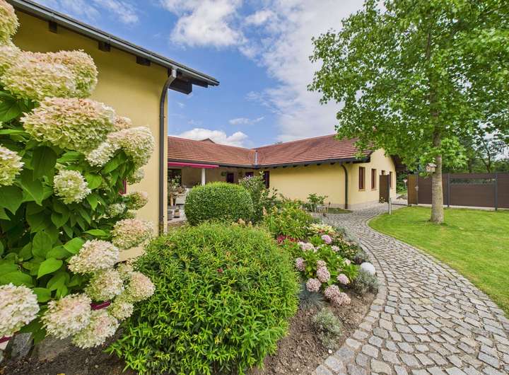 Der Außenbereich ist ebenso durchdacht wie repräsentativ: Ein gepflegter, pflegeleichter Garten mit Gartenhaus bildet den Rahmen, während der beheizte Pool (8 x 4 m) mit Gegenstromanlage und integrierter Treppe zum Mittelpunkt sommerlicher Stunden wird. Von hier genießen Sie einen unverbauten Blick über die weite Landschaft – wie ein Stück Urlaub im Alltag.