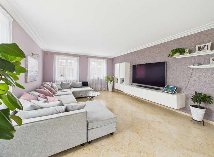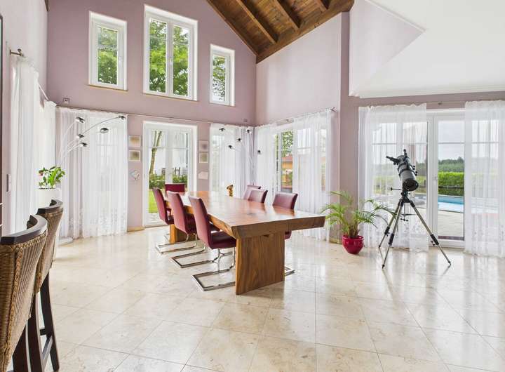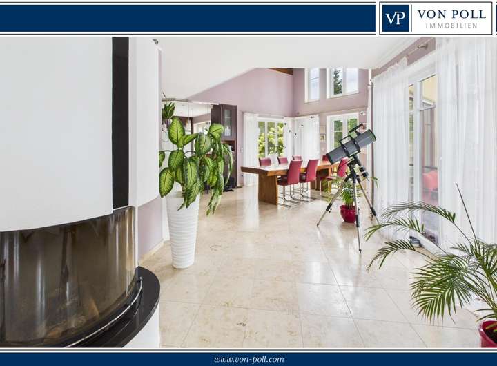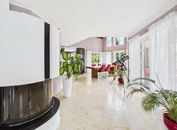 Hochwertige Materialien wie Wenge-Parkett, Jura-Naturstein, Granittreppen und die durchdachte Ausstattung mit Fußbodenheizung, Kamin, zentraler Staubsaugeranlage und indirekter Beleuchtung runden dieses Angebot ab.
