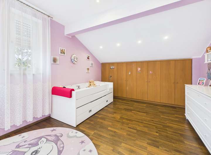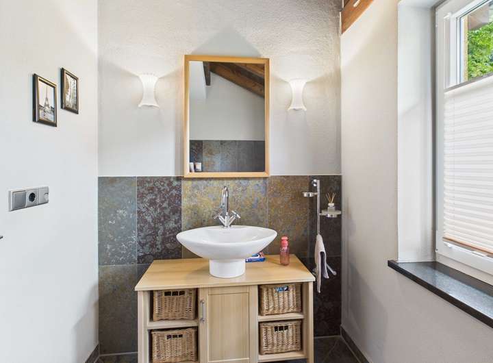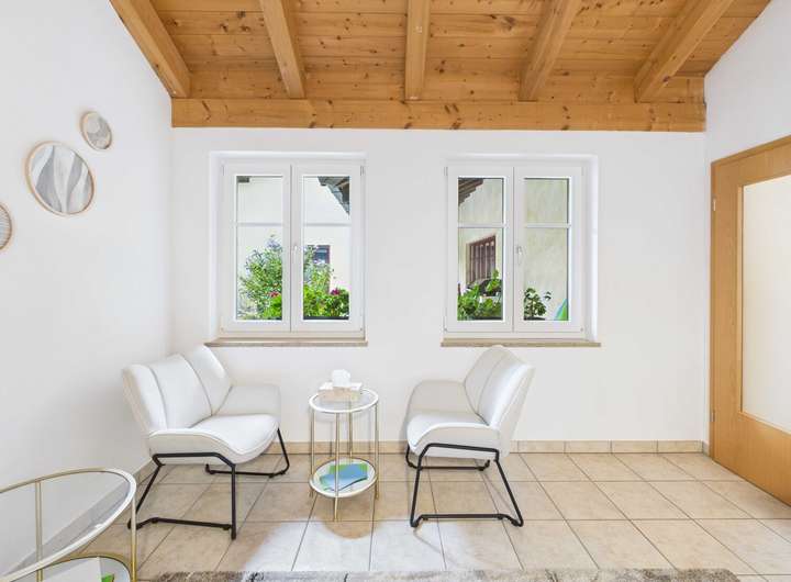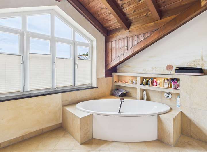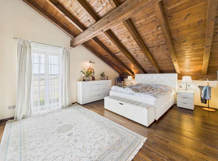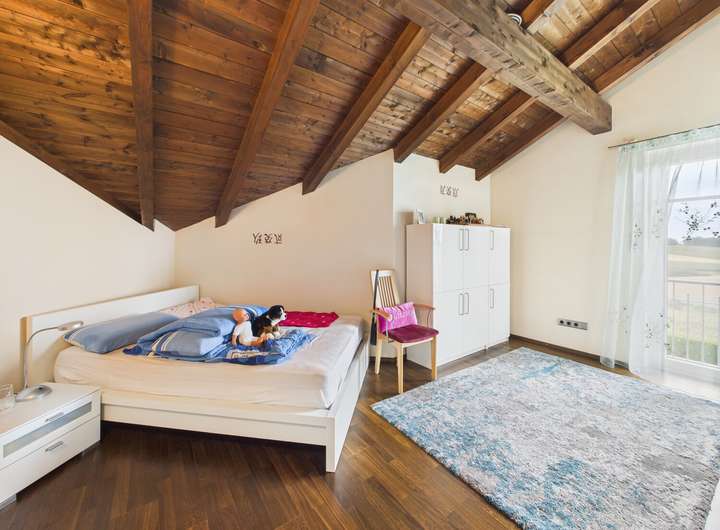 Im Obergeschoss erwarten Sie drei gemütliche Schlafzimmer sowie zwei edel ausgestattete Bäder. Besonders die Eckbadewanne mit Blick ins Grüne verspricht erholsame Stunden. Alle Räume sind durch den offenen Dachstuhl geprägt und vermitteln Wärme und Behaglichkeit.