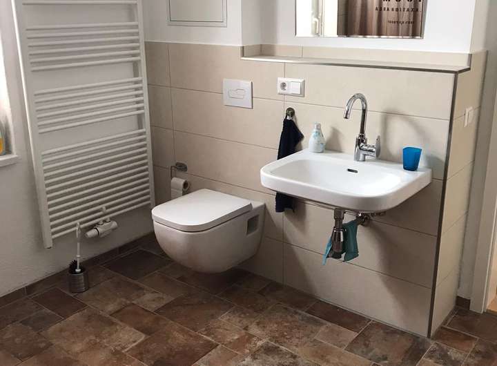Im Hauswirtschaftsraum hängt die zentrale Gas-Brennwert-Heizung. Die Warmwasserversorgung erfolgt über Elektro-Durchlauferhitzer. Im Keller befinden sich die Brunnenpumpe und der Wasser- und der Gasanschluss. Das Haus verfügt über zwei Stromzähler und zwei Heizkreise.