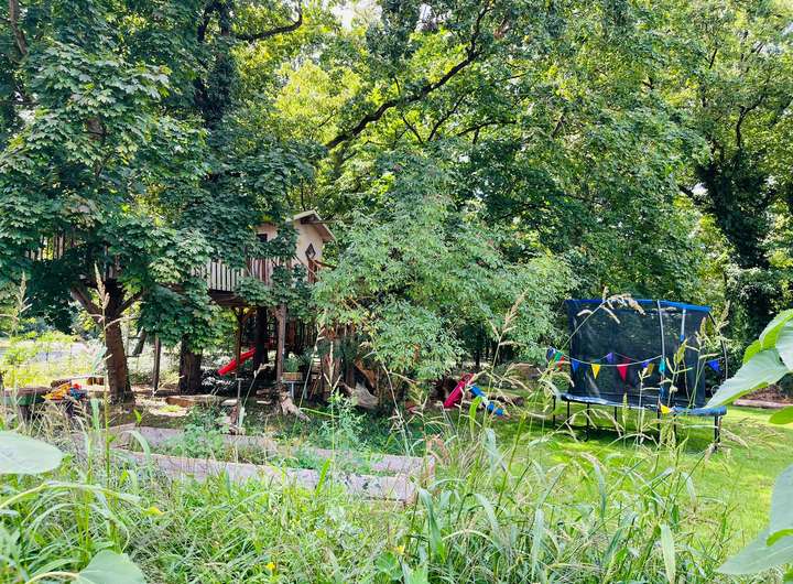 Die Grundstücksfläche von rd. 3.668 m2 ist mit einem Zaun begrenzt und verfügt über zwei Einfahrten. Auf einer Pflasterfläche von rd. 100 m2 stehen 3 Stellplätze zur Verfügung. Darüber hinaus gibt es auf dem Grundstück eine überdachte Sommerküche, Wege, drei Terrassen, einen Werkzeugcontainer, viele Beete und ein „Wäldchen“ mit einem zimmermannsmäßig hergestellten Baumhaus mit vielen Kletter- und Spielmöglichkeiten. Das Grundstück gehört zum Mietgegenstand.