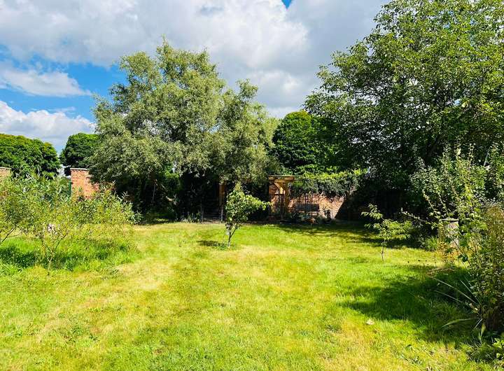 Das Gebäude ist von der Straße zurück gesetzt, umgeben von einem Naturgarten und einem kleinen Laubwald.