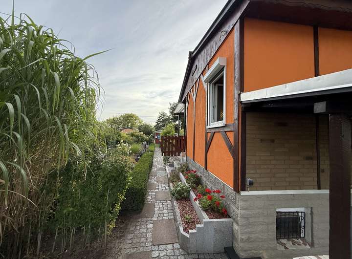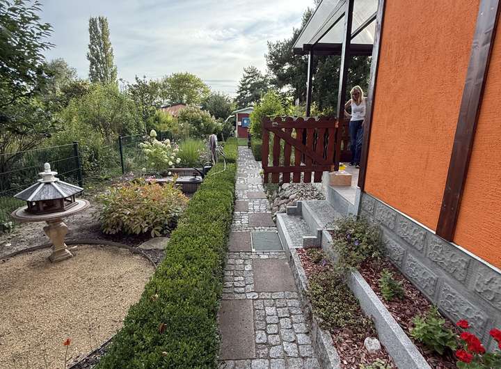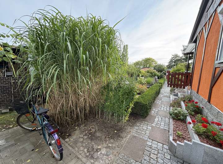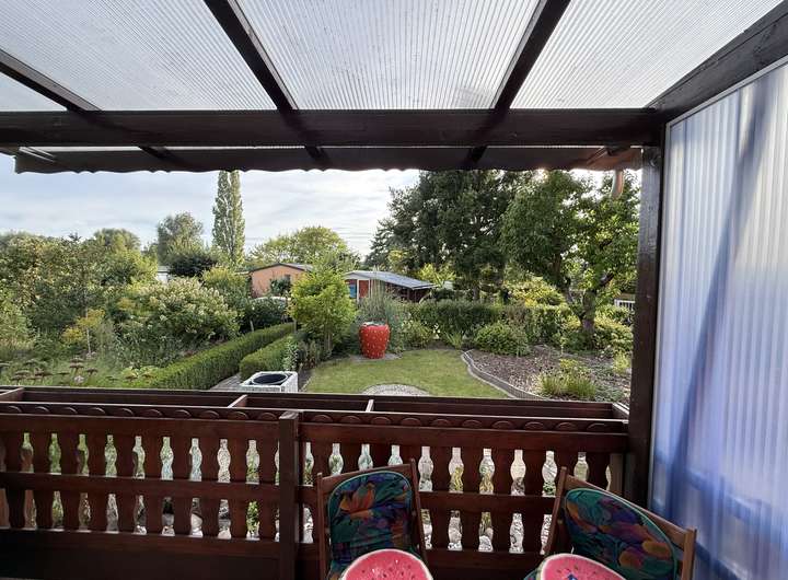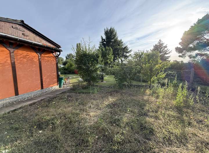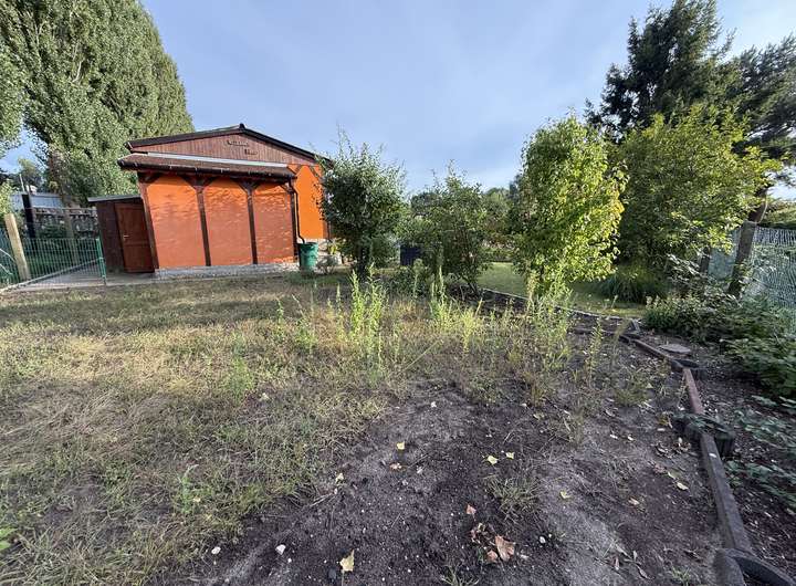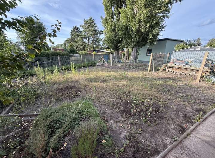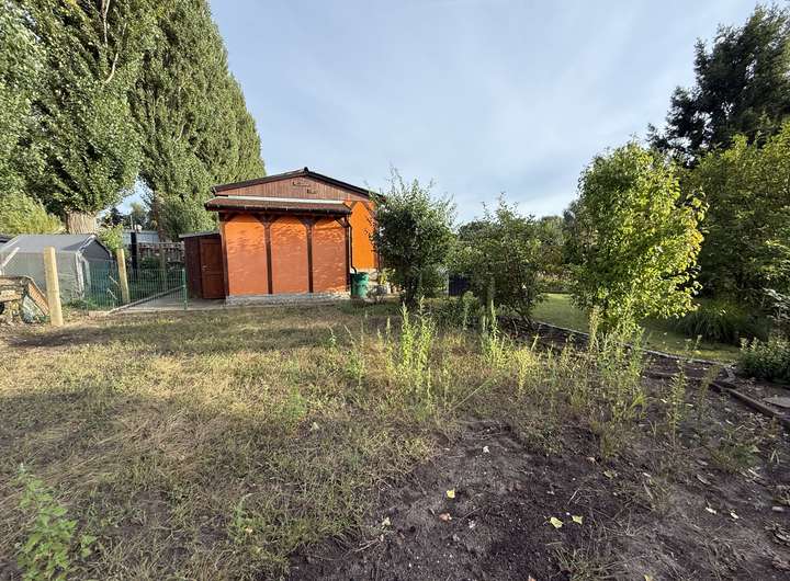 Es handelt sich um eine Parzelle (Größe der individuell umzäunten, eigenen Parzelle ohne Gemeinschaftsflächenanteile s. Feld "Grundstücksgröße") in einer großzügigen Anlage mit 57 Erholungsgärten.