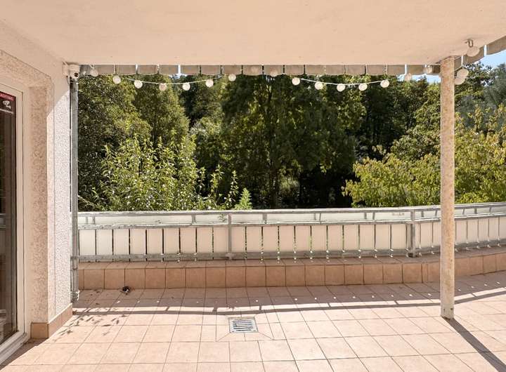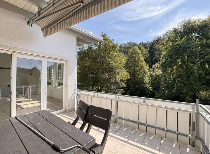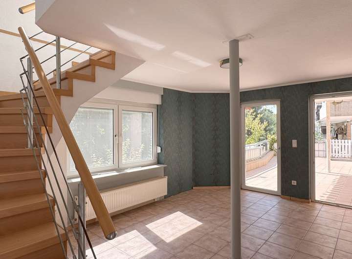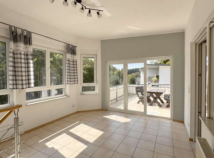 Eine offene Treppe führt vom Wintergarten ins Souterrain. Hier befindet sich eine große teilüberdachte Terrasse mit über 8,50 m Länge auf ca. 4 m Breite – ebenfalls toller Ausblick.