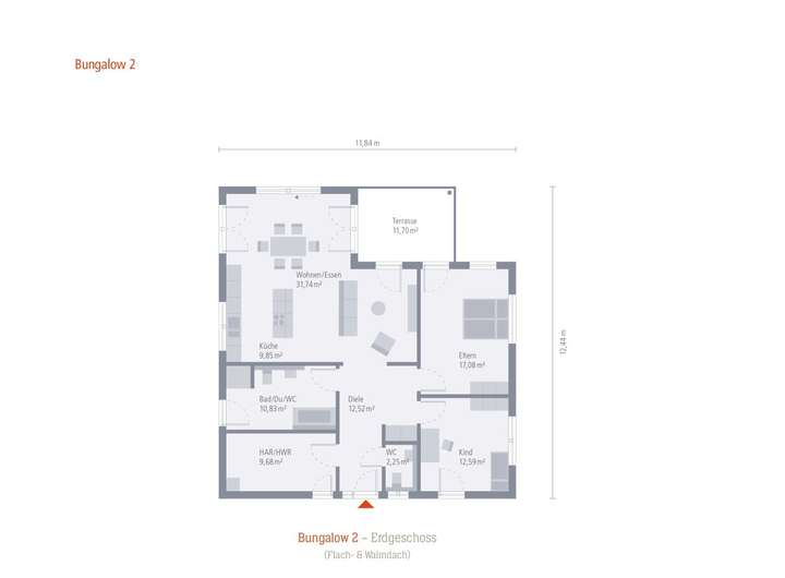 Klein, aber oho - so präsentiert sich der Bungalow 2 und ist damit das ideale Domizil für Singles, Paare und Kleinfamilien. Auf einer Fläche von rund 118 qm treffen eine perfekt durchdachte Planung und maximales Wohlfühlambiente aufeinander. Zentrum und absolutes Highlight des Hauses ist der große Wohn-Ess-Kochbereich. Durch den besonderen Grundriss findet sich die Essecke in einem kleinen, lichtdurchfluteten Erker mit Rundumblick in den Garten. Von hier führt eine Tür auf die knapp 12 qm große, überdachte Terrasse, die vor allem in den warmen Monaten zum Verweilen und Relaxen einlädt. Von hier führt auch eine Tür ins großzügig gestaltete Elternschlafzimmer. Das Raumangebot wird abgerundet durch ein Kinderzimmer, das alternativ auch als Büro oder Gästezimmer genutzt werden kann, ein großes Badezimmer mit Badewanne, Dusche und WC, einen Hauswirtschaftsraum sowie ein Gäste-WC. Wählen Sie auch bei diesem Bungalow zwischen Walm- und Flachdach.