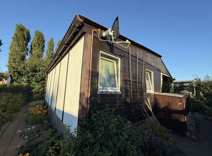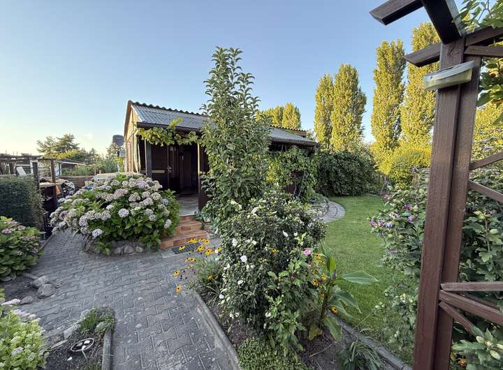 Es handelt sich um eine Parzelle (Größe der individuell umzäunten, eigenen Parzelle ohne Gemeinschaftsflächenanteile s. Feld "Grundstücksgröße") in einer großzügigen Anlage mit 57 Erholungsgärten.