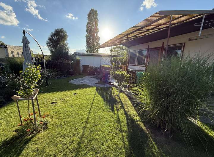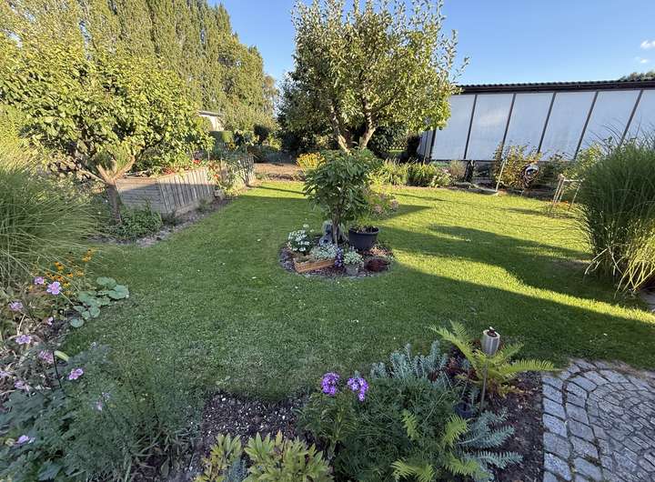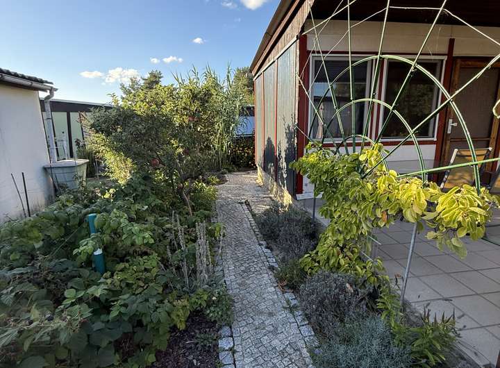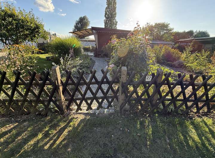 Es handelt sich um eine Parzelle (Größe der individuell umzäunten, eigenen Parzelle ohne Gemeinschaftsflächenanteile s. Feld "Grundstücksgröße") in einer großzügigen Anlage mit 57 Erholungsgärten.