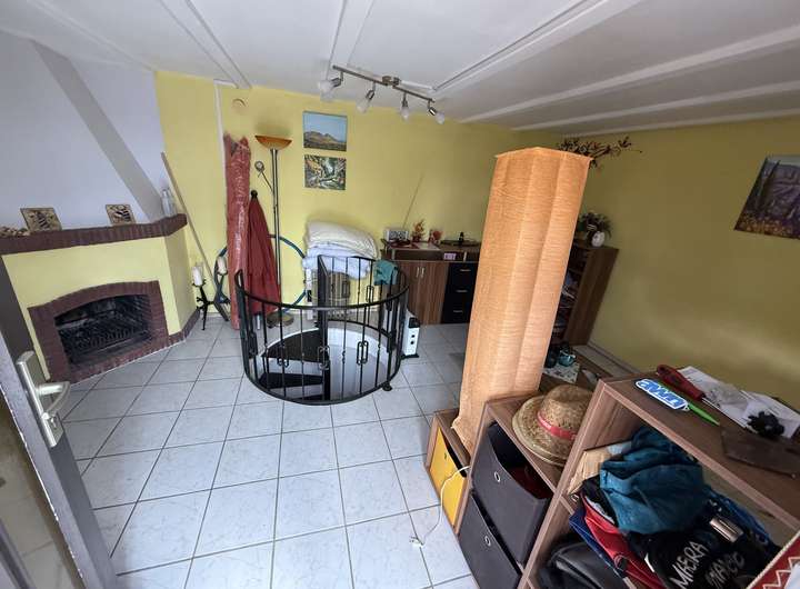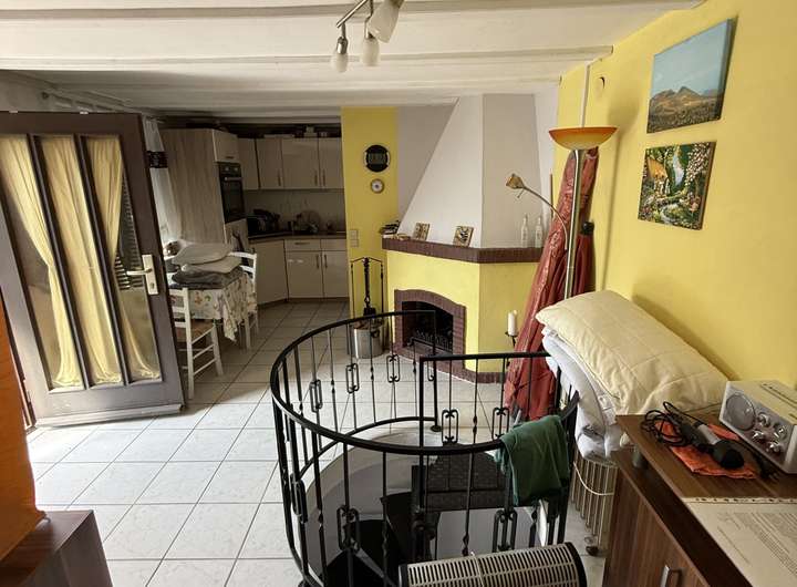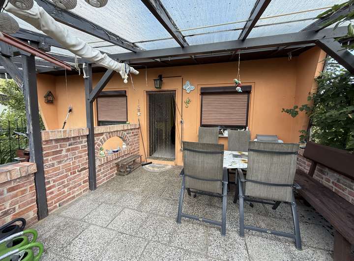 Modernisierter Bungalow aus Stein, zwei Etagen (oben Wohnen, unten Schlafen), Garten mit Teich.