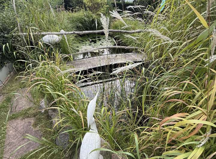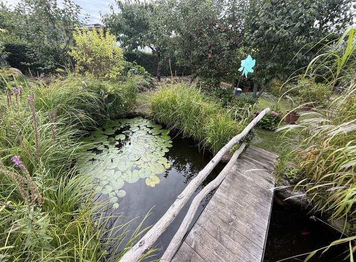 Hier: Parzelle 43; Bungalow mit Garten - großer Teich mit Holzbrücke