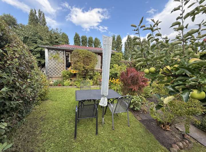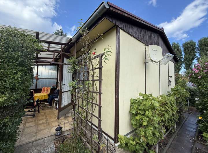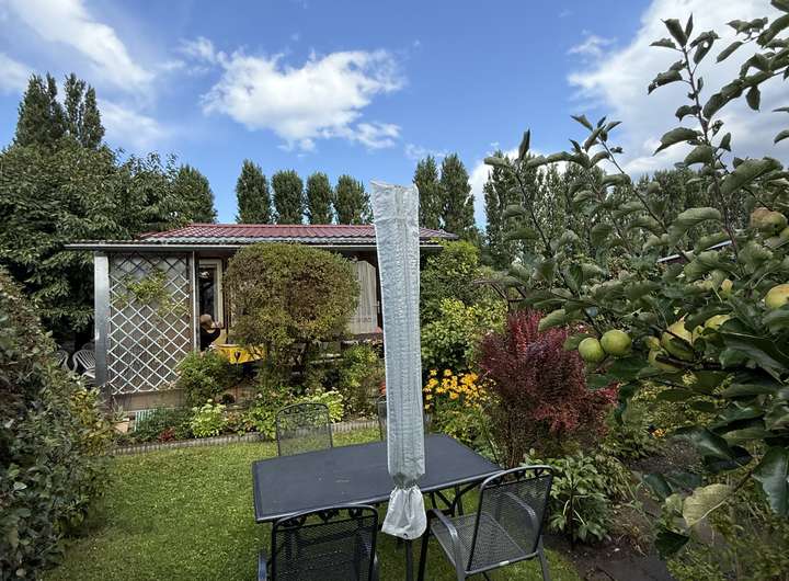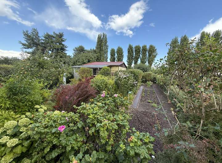 Es handelt sich um eine Parzelle (Größe der individuell umzäunten, eigenen Parzelle ohne Gemeinschaftsflächenanteile s. Feld "Grundstücksgröße") in einer großzügigen Anlage mit 57 Erholungsgärten.