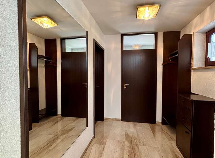 Ein geräumiger Eingangsbereich mit viel Platz für Garderobe, ein Gäste WC, ein Badezimmer und ein Schlaf/Gästezimmer komplettieren das Erdgeschoss.