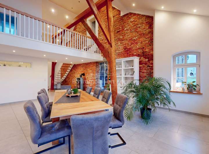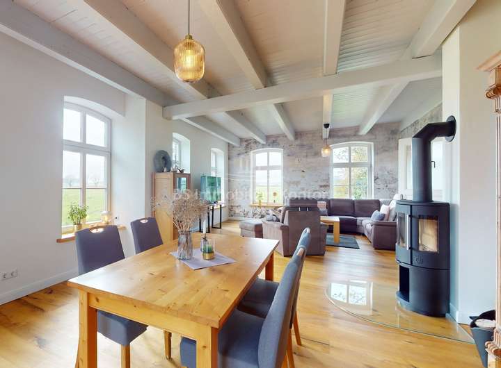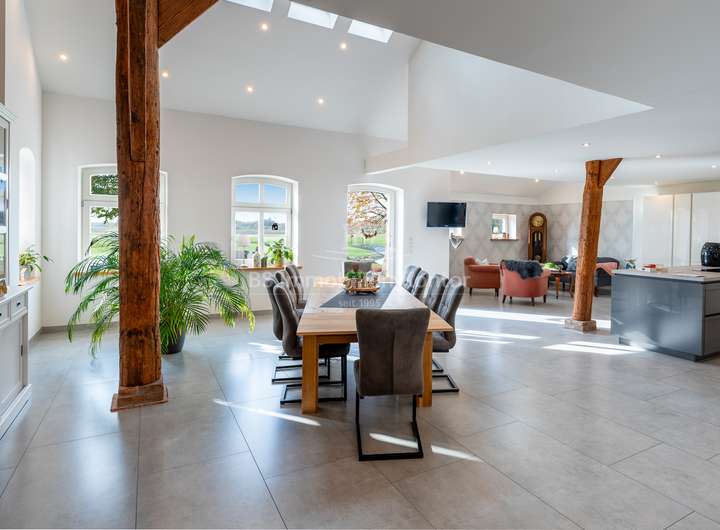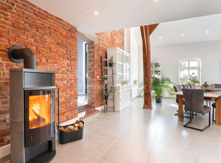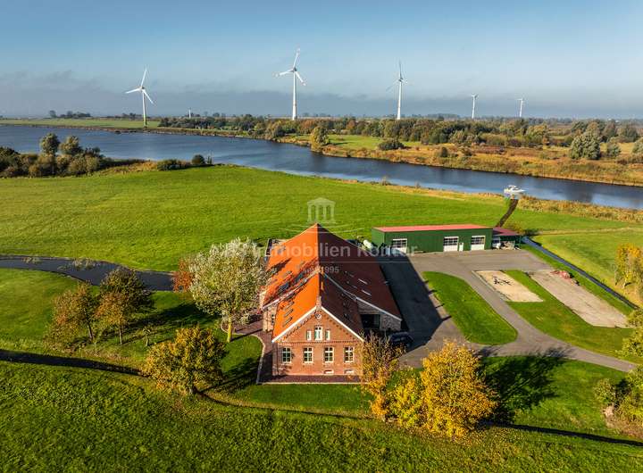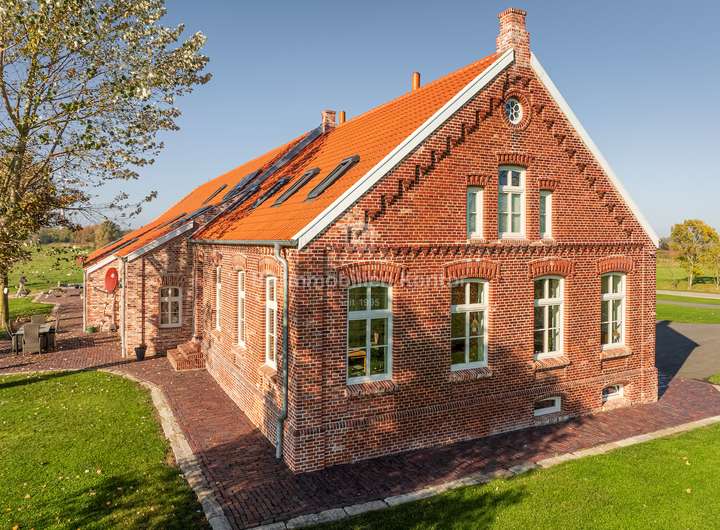 Dieser historische Gulfhof aus dem Jahr 1726 ist eine außergewöhnliche und zugleich eine einmalige Gelegenheit für Liebhaber denkmalgeschützter Immobilien und Naturverbundene die das Besondere lieben. Das Grundstück befindet sich in einer malerischen Lage direkt am Knockster Tief und verfügt über ein eigenen Bootsanleger. Weitläufige und unverbaute Grünflächen bieten einen freien Blick in alle Richtungen. Das Ensemble wurde für die denkmalgerechte Restaurierung (2019-2021) vom Verein: "Anno Gesellschaft zur Erhaltung Ostfriesischer Kultur- und Baudenkmale" ausgezeichnet und verbindet auf eindrucksvolle Weise den authentischen Charme vergangener Jahrhunderte mit den Annehmlichkeiten und dem Komfort moderner Wohnansprüche. Der Umbau wurde von ein Architekturbüro begleitet und in enger Abstimmung mit der Denkmalschutzbehörde durchgeführt. Dank umfassender Sanierungsarbeiten wurde der KfW-70-Standard erreicht, wodurch die Energieeffizienz des historischen Gebäudes maßgeblich verbessert wurde (Blower Door Test vorhanden). Aufgeteilt in einen großzügigen Hauptwohnbereich und eine separate Einliegerwohnung, eröffnet diese Immobilie vielfältige Nutzungsmöglichkeiten. Neben dem Hofgebäude bietet ein Nebengebäude zusätzliche Unterstellmöglichkeiten. Die innenliegende Scheune (ca. 250qm Fläche) schafft zusätzlichen Platz für individuelle Bedürfnisse. Ausgestattet mit zwei Duschbädern incl. WCs, Theke und freien Blick auf das Ständerwerk lässt dieser Bereich keine weiteren Wünsche mehr offen. Im Inneren der Immobilie zeichnen sich die Räumlichkeiten durch eine lichtdurchflutete Atmosphäre aus, die ein angenehmes Wohnambiente schaffen. Beheizt wird das Objekt durch eine Gas-Z.-Heizung (Fußbodenheizung). Mehrere Kamine verleihen zusätzliche Behaglichkeit und schaffen eine gemütliche Wohnatmosphäre. Die doppelverglasten und stilgerechten Holzfenster ergänzen die detailgetreue Restaurierung und bieten eine ideale Balance zwischen historischer Ästhetik und zeitgemäßer Energieeffizienz. Das Grundstück verfügt zudem über einen formschönen Naturteich mit Fischbesatz. Der Garten ist pflegeleicht angelegt und mit einem Rasenmähroboter ausgestattet, welcher bis zu 70 Prozent des Rasens automatisch mäht, was den Pflegeaufwand erheblich reduziert. Dieses außergewöhnliche Anwesen ist eine seltene Gelegenheit, ein Stück Geschichte zu erwerben und dies zugleich in einer einzigartigen Lage am Wasser zu genießen. Der historische Gulfhof von 1726 am Knockster Tief vereint Exklusivität, Ruhe und die Schönheit der Natur in einer Immobilie, die durch ihre denkmalgeschützte Architektur und die herrliche Lage ein ganz besonderes Juwel ist.