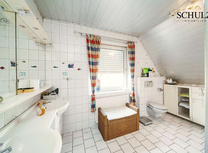 Das Tageslichtbad im Obergeschoss ist mit Dusche, Badewanne und modernen Ausstattungsdetails versehen – perfekt für entspannte Momente. Die Bodenbeläge aus Fliesen, Laminat und Kork schaffen eine wohnliche Atmosphäre und sind zugleich pflegeleicht.