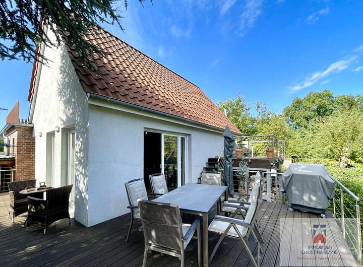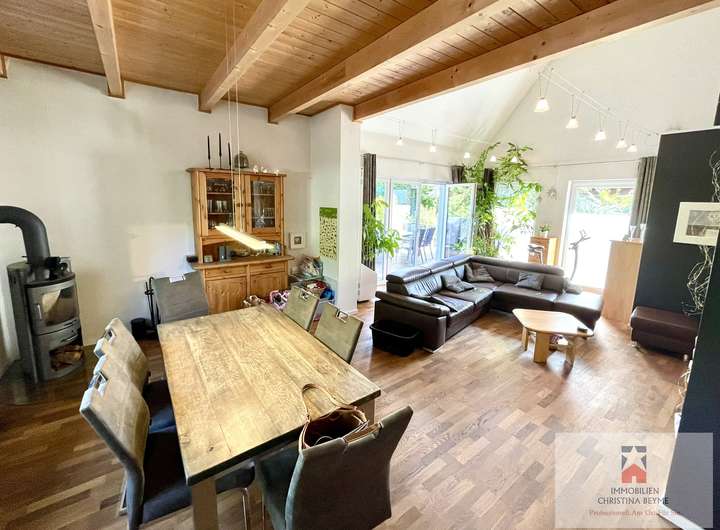 Das Haus verfügt über vier Schlafzimmer, ein gemütliches Wohnzimmer mit Ofen sowie eine Galerieebene, die für ein besonderes Wohnambiente sorgt. Mehrere Terrassendecks eröffnen Ihnen traumhafte Ausblicke in den liebevoll angelegten Garten – ein wahres Paradies für Naturfreunde und Erholungssuchende.