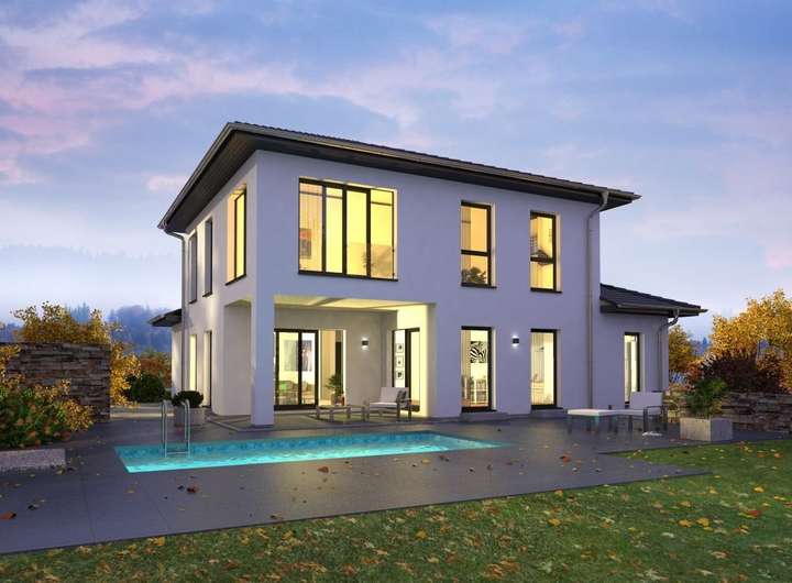 Die Staffelvilla mit Walmdach beeindruckt durch ihre klare Struktur. Die reduzierte Form wird architektonisch durch das zweiseitig zurückgesetzte Obergeschoss und den elegant zurückspringenden Terrassenbereich im Erdgeschoss harmonisch ergänzt. Dieser Bereich verbindet nahtlos Innen- und Außenräume und ist sowohl vom offenen Wohn- als auch vom Essbereich zugänglich. Durch den großzügigen Baustil erhält das Erdgeschoss einen exklusiven Bungalowcharakter. Eine halbgewendelte Treppe, die zentral im Wohnraum integriert ist, führt in die obere Etage. Dort vervollständigen der luxuriöse Elternbereich mit Bad en suite, zwei Kinderzimmer sowie ein zusätzliches Dusch-WC das großzügige Raumangebot. OKAL-Standard: etwa 2,80 m Deckenhöhe in beiden Etagen und viel Lichteinfall durch bodentiefe Rundumverglasung.