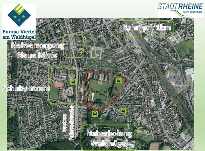 Das Europa-Viertel liegt im Süden von Rheine am Rande des Naherholungsgebiets Waldhügel – mit optimaler Anbindung an den Bahnhof und die Innenstadt. Schulen, Kindergärten und Einkaufsmöglichkeiten sind direkt nebenan.