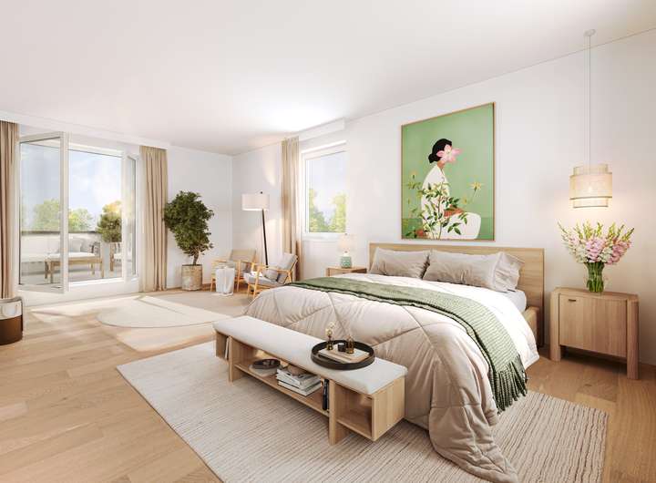 Die abgebildeten Visualisierungen sind beispielhaft und können von der späteren Ausführung abweichen. Maßgeblich sind ausschließlich die vertraglich vereinbarten Unterlagen und die Bau- und Ausstattungsbeschreibung.