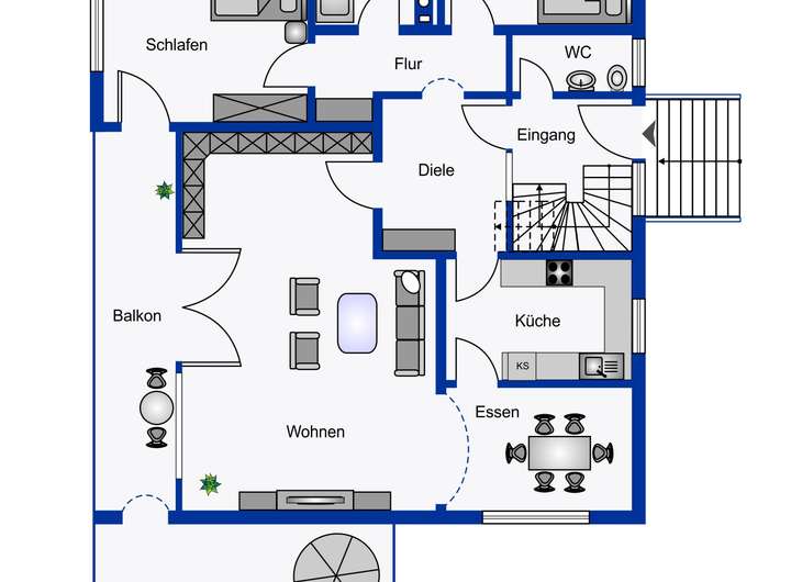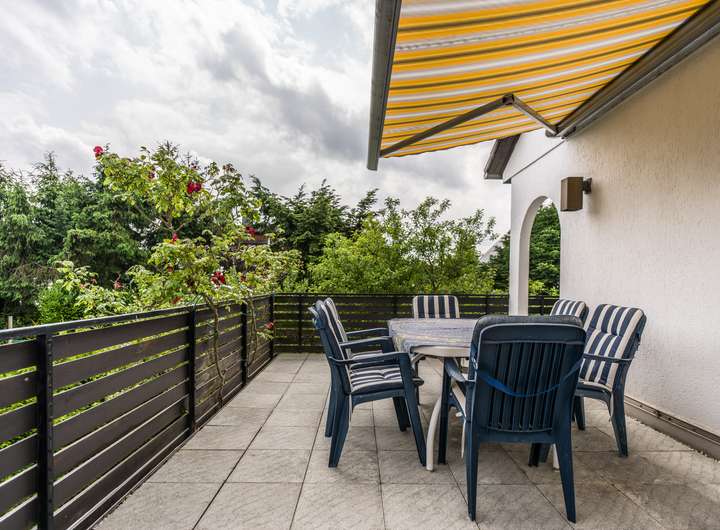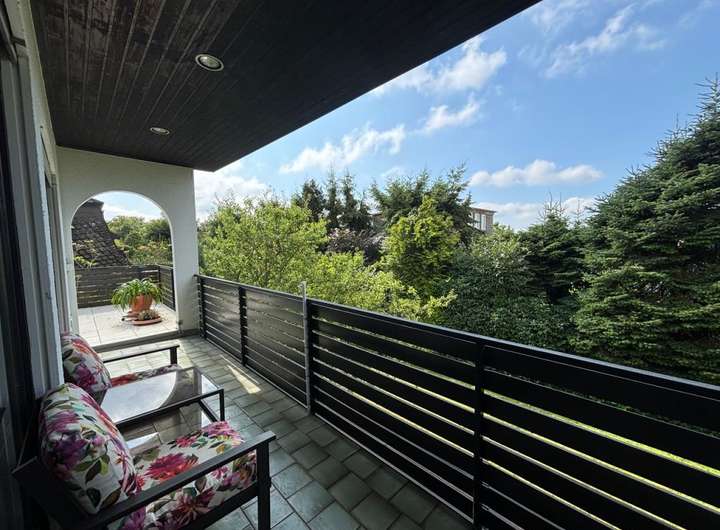 Vom 46 m² Wohn- und Essbereich schauen Sie aus großen Fenstern ins Grüne. Der Balkon liegt nach Süden, Von hier kommen Sie direkt auf die große Hochterrasse über der Garage: genießen Sie den Sommer!